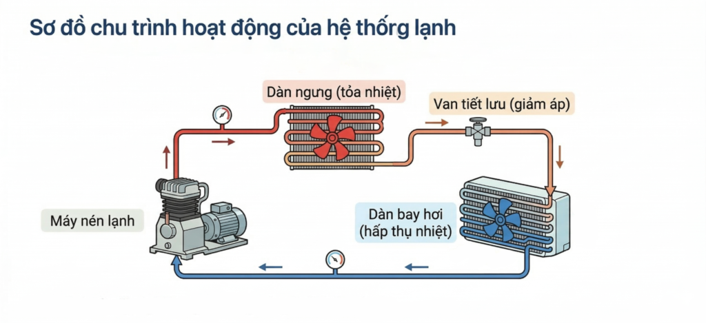 Một hệ thống lạnh tiêu chuẩn hoạt động theo chu trình tuần hoàn gồm bốn thiết bị chính: máy nén lạnh, dàn ngưng, van tiết lưu, dàn bay hơi.